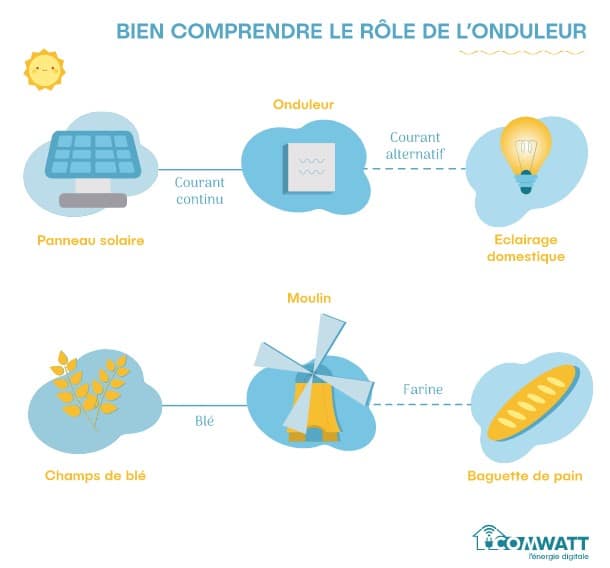 C’est pourquoi, l’installation de panneaux solaires inclue toujours un onduleur photovoltaïque. Il s’agit d’un petit appareil qui change le courant continu en courant alternatif. Il existe deux types d’onduleur : l’onduleur central et le micro-onduleur. Comme le montre le petit schéma explicatif ci-dessous, l’onduleur est un peu comme un moulin. Il rend l’électricité solaire consommable pour vos ampoules, votre lave-vaisselle, votre ordinateur, votre télévision, etc. Bref, tous les objets électriques qui participent à votre vie quotidienne.